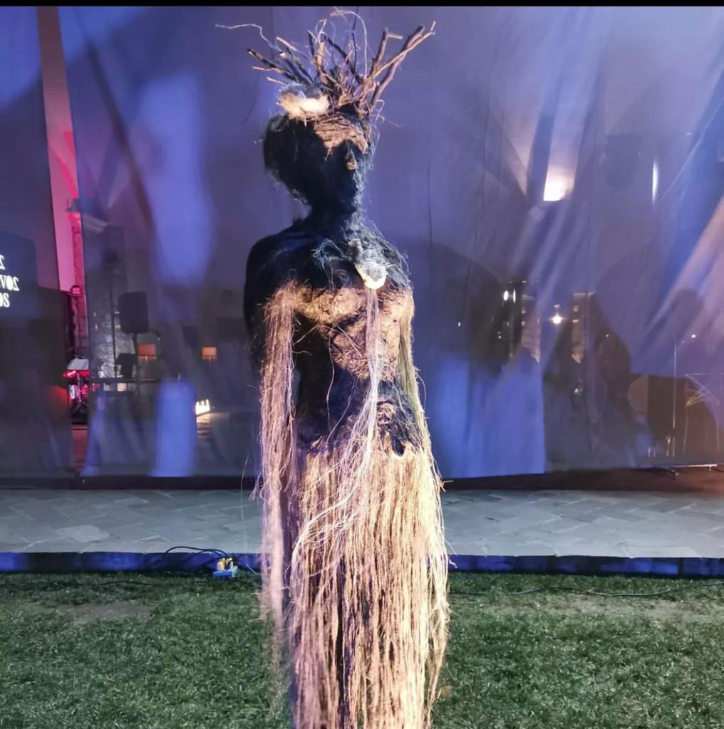 The show was bedazzling even before the runway started. Outside on the crisp fall evening, a mannequin by Alfie Rojas next to an exotic dress of raffia.